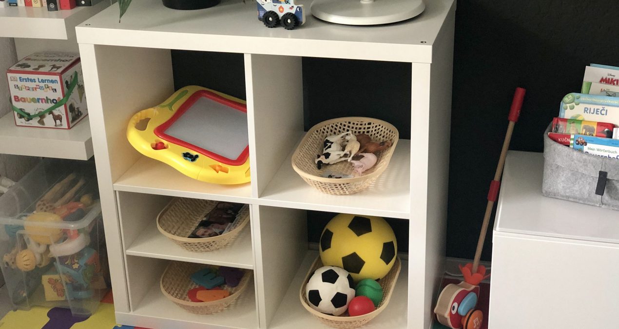 On the bottom right shelf, we have a ball basket. This is basically a basket filled with balls. On our last rotation, we had a language basket with different items and one of them was a ball. He never touched any other item except the ball. Sometimes he is throwing it in the air, sometimes he is kicking it with his feet, and sometimes he brings his ball to me and wants to play pass-the-ball. We learned that our hallway is a safe place to play with the ball so he always brings his ball there before he starts to play. Well, most of the time at least. Also, I always pay attention that the balls here are light and soft so all the windows in our house are safe.